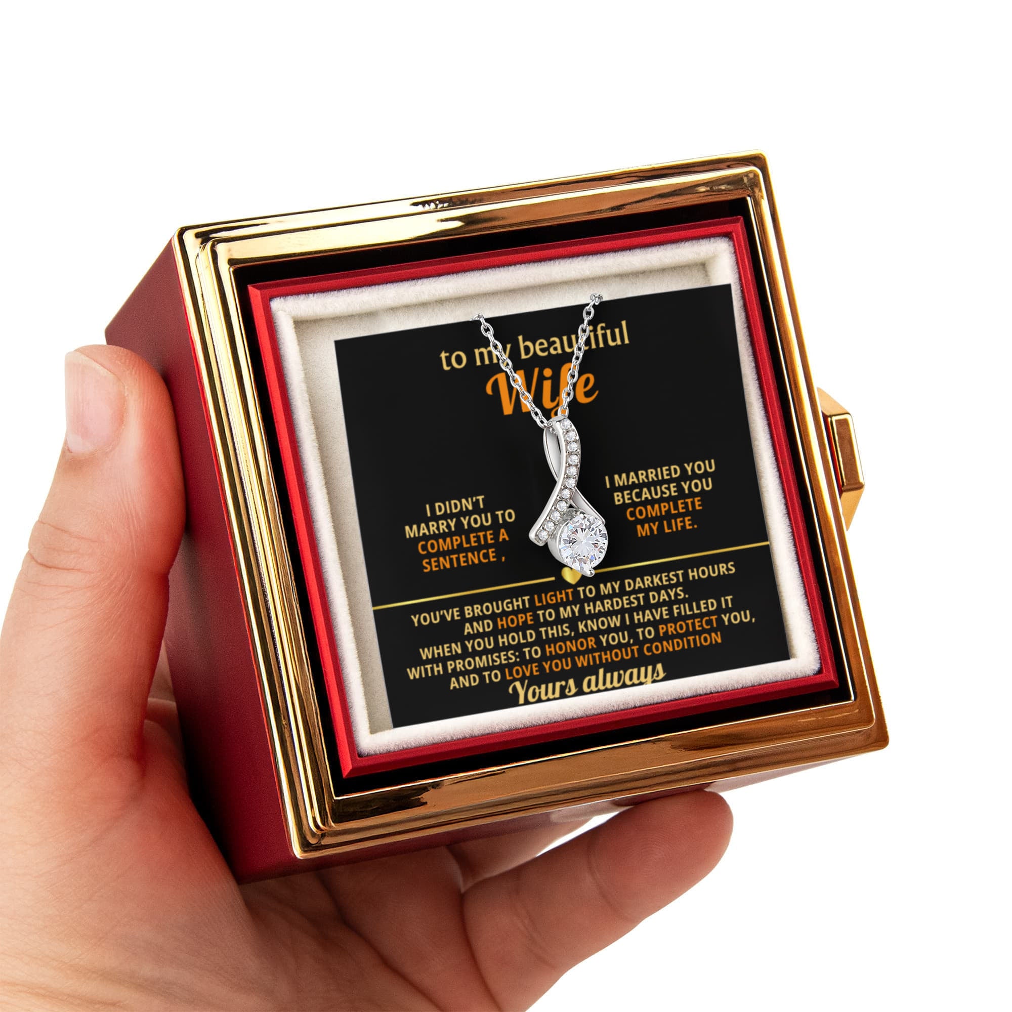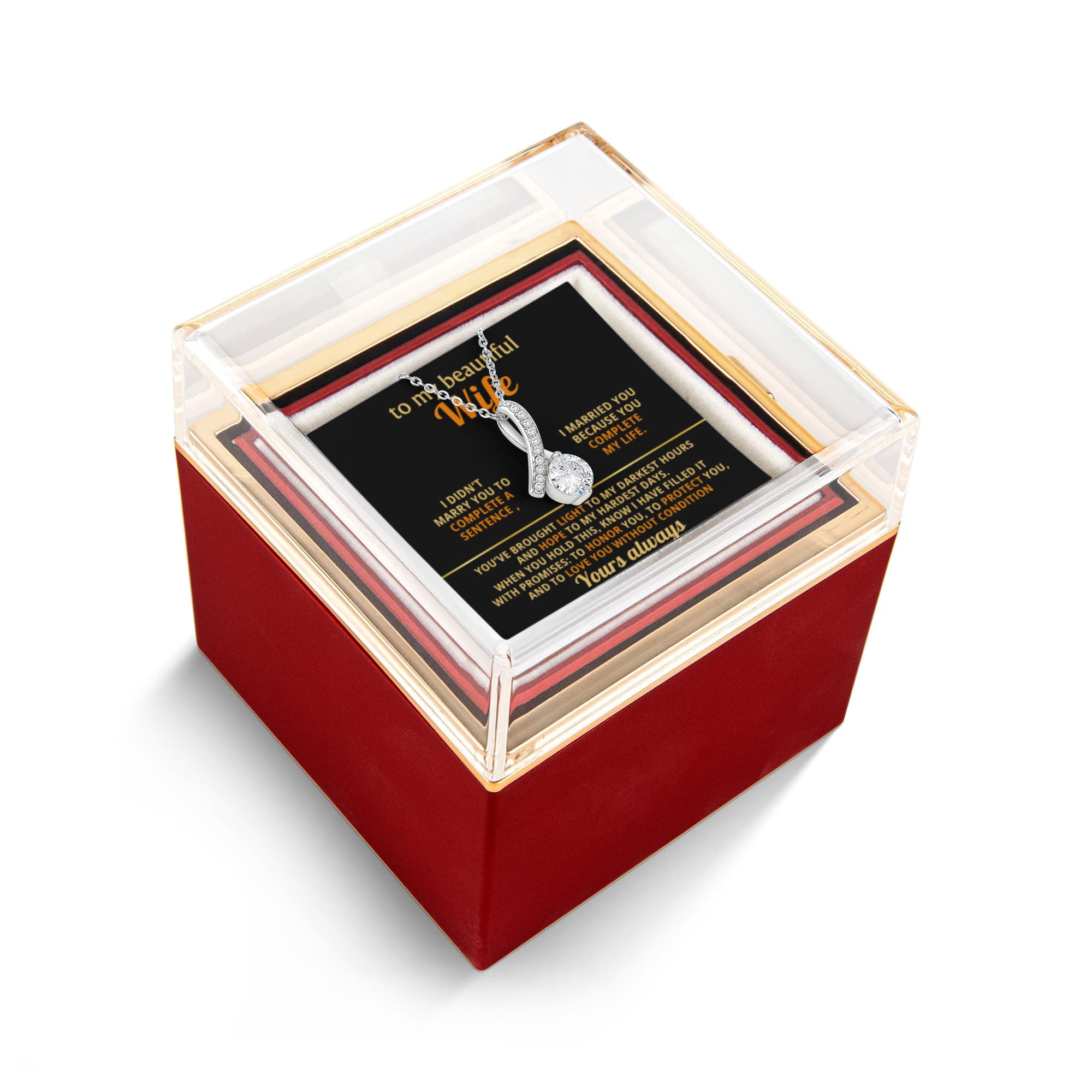 Imagine her reaction as she receives this beautiful Alluring Beauty Necklace. The luxurious box, featuring a charming preserved rose that never fades, adds an extra touch of love. With a simple turn of the gold knob, her breathtaking gift is revealed—making it the perfect sentimental gift for that special someone.